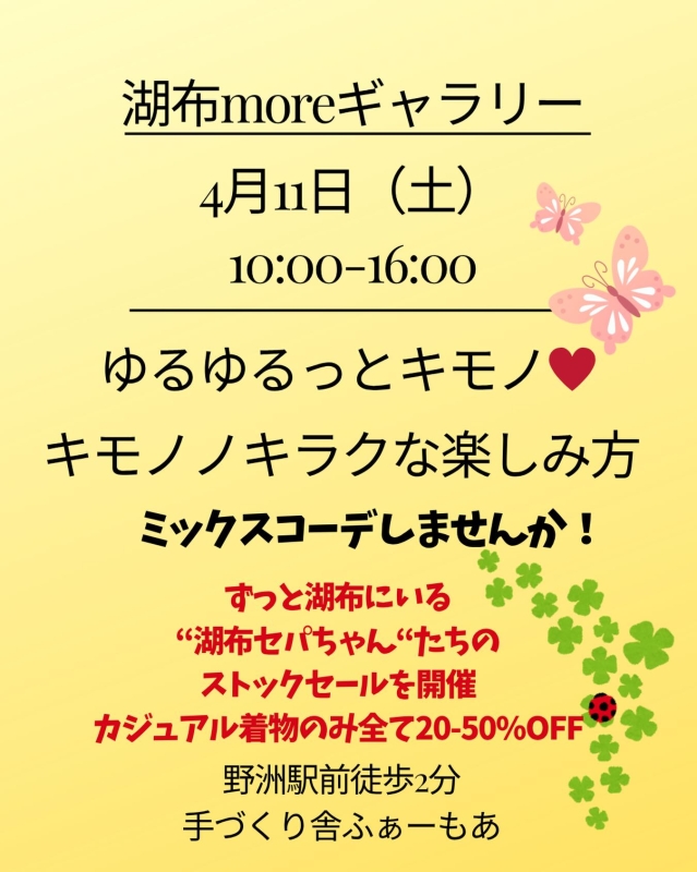 湖布さんのお陰で色々な方と出会う事が出来、知り合いも増えました。今後、私の周りで着物に興味ある方が居たら迷わず『湖布さん』を紹介したいと思います。これからもよろしくお願い致します。
