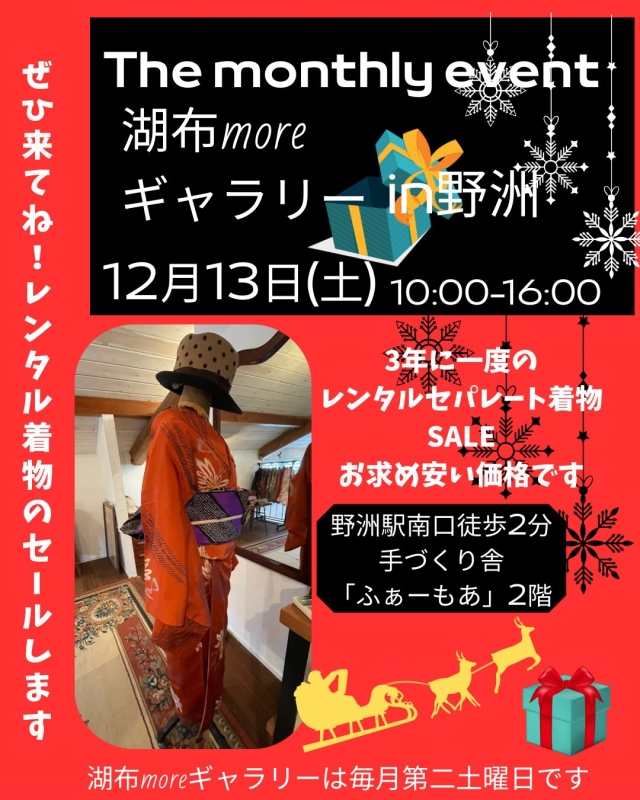 『湖布moreギャラリー』12月13日(土)のご案内です 年の瀬、迫ってきましたね🌲 湖布では、3年に一度、レンタルで使用したお着物の一部をリーズナブル... >>続きを読む